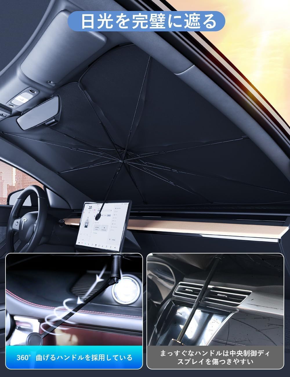 車用傘型サンシェードのハンドルはダッシュボードの高低により、曲がるデザインを採用し、360度回転できます。