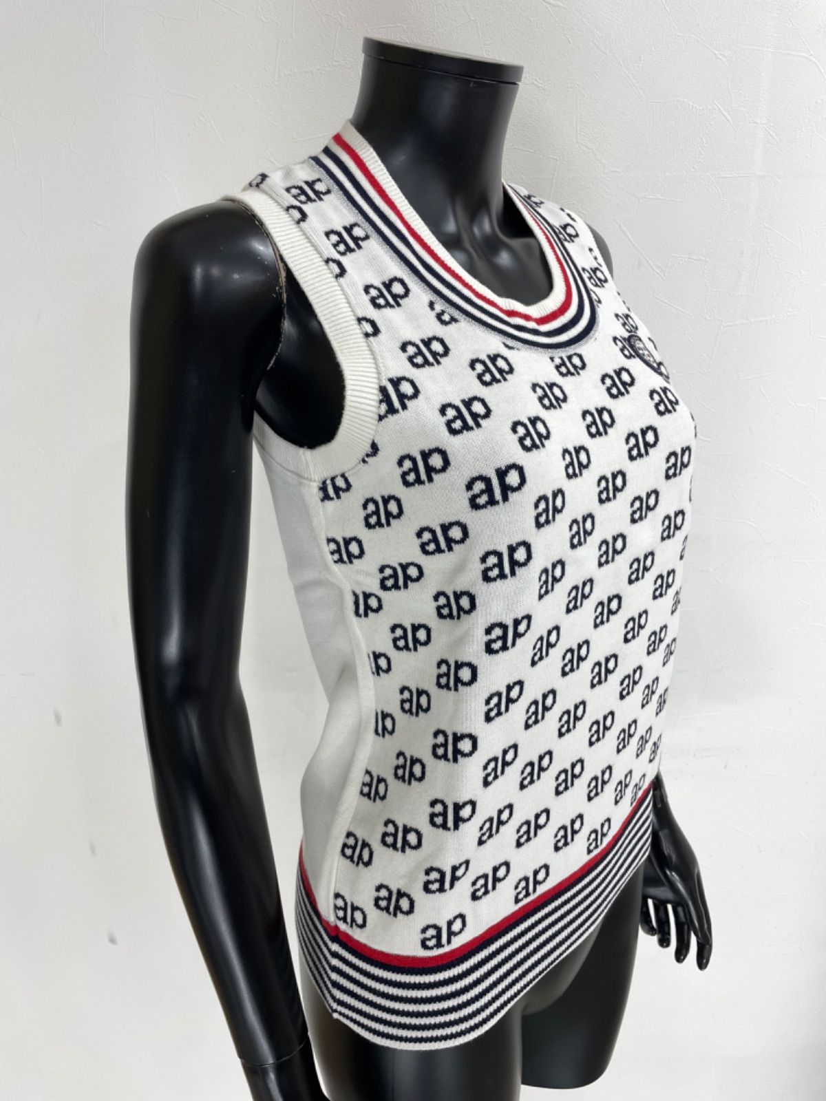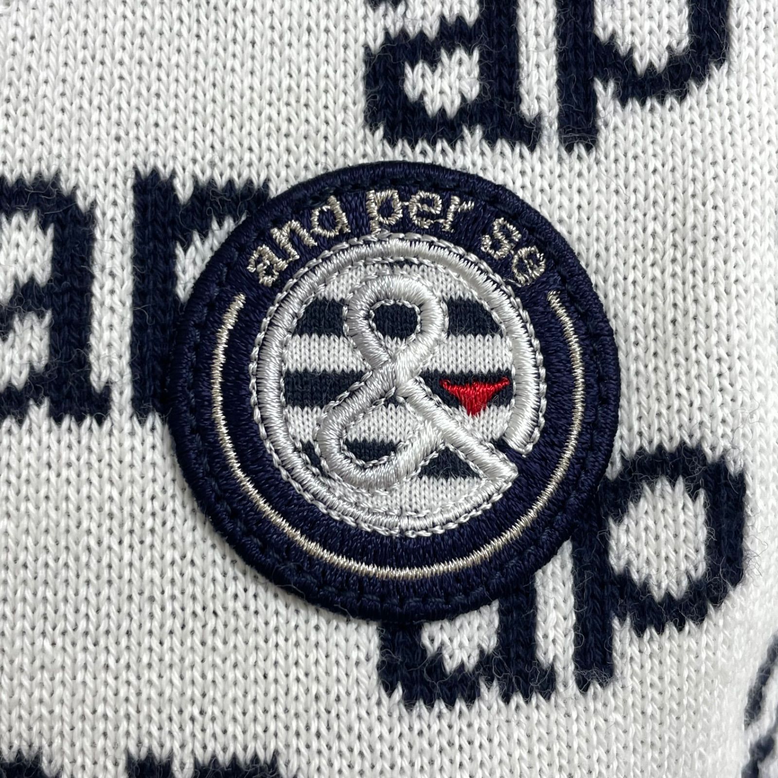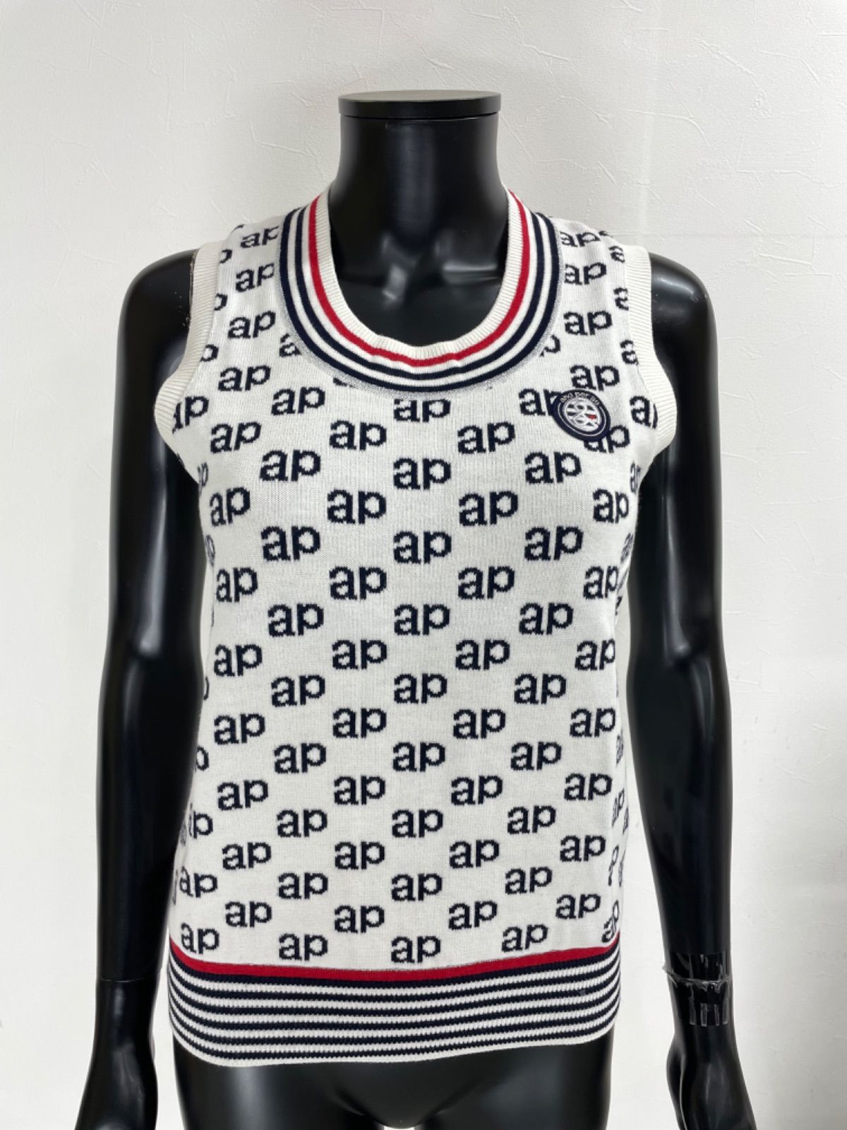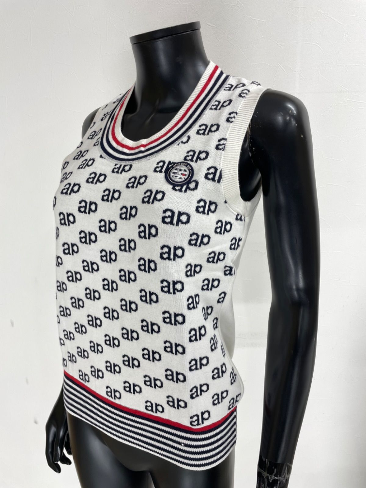 【USED】and per se アンパスィ 綿 アクリル ニット ベスト ワッペン 総柄 ホワイト 白 レディース M ゴルフウェア