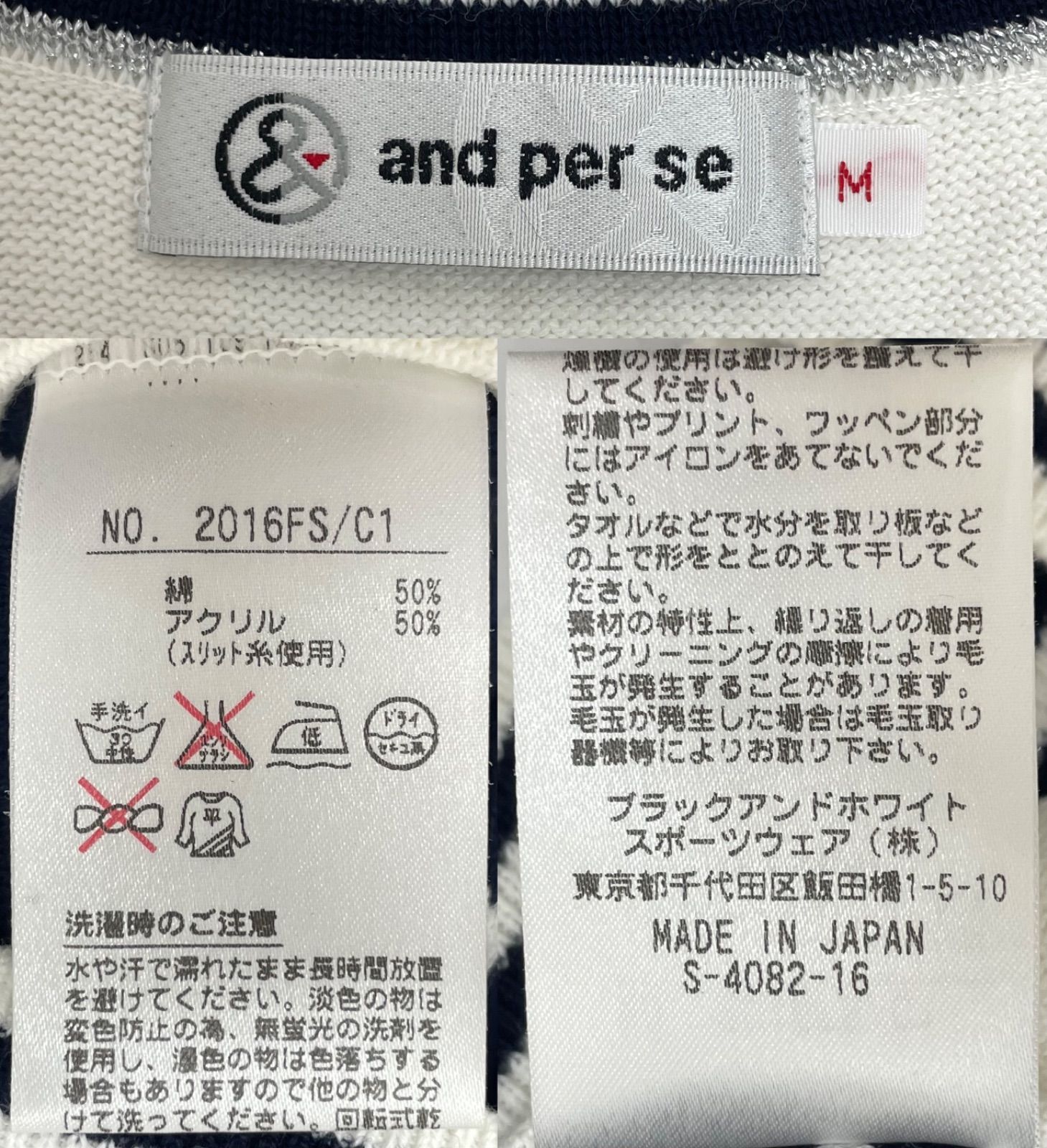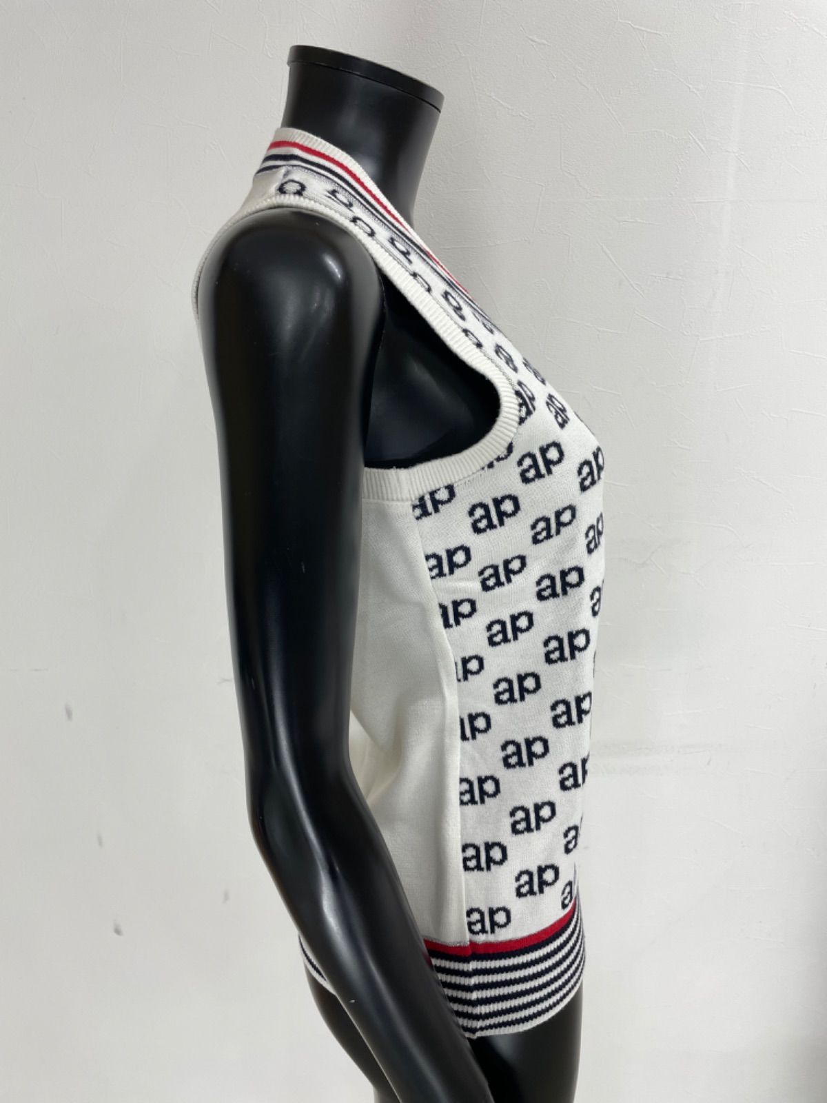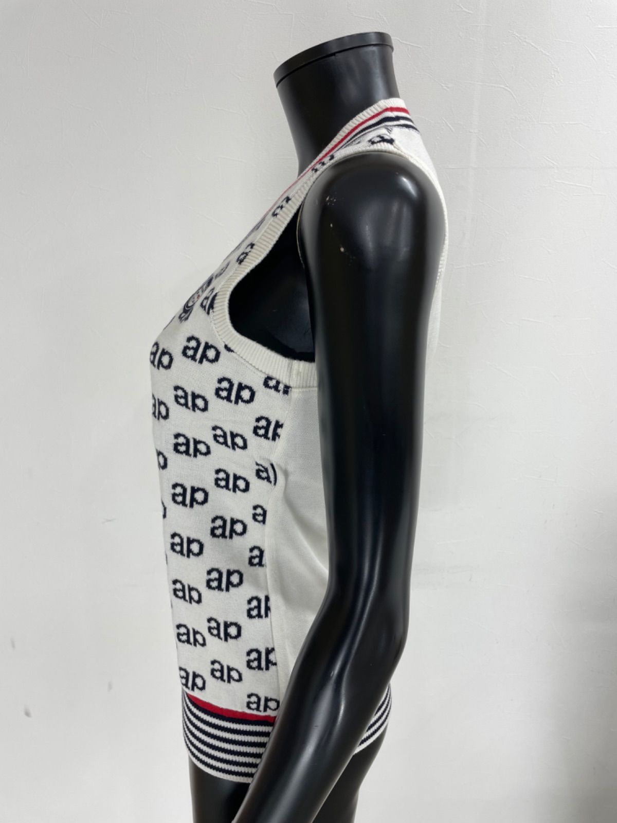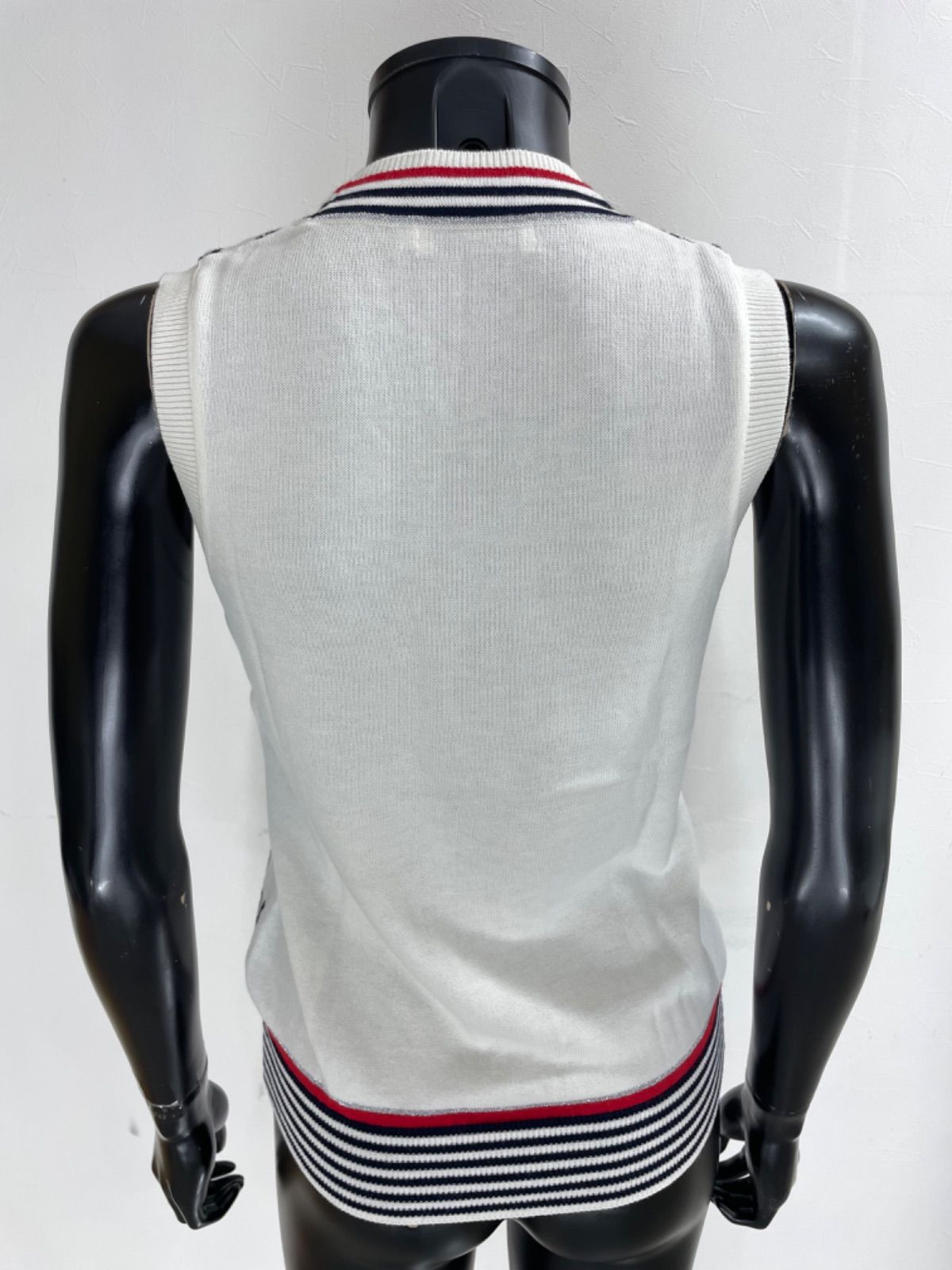 【USED】and per se アンパスィ 綿 アクリル ニット ベスト ワッペン 総柄 ホワイト 白 レディース M ゴルフウェア