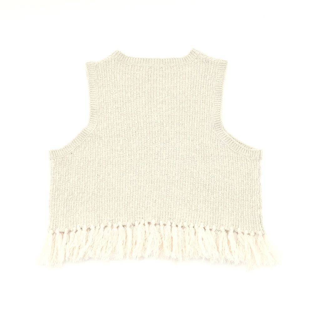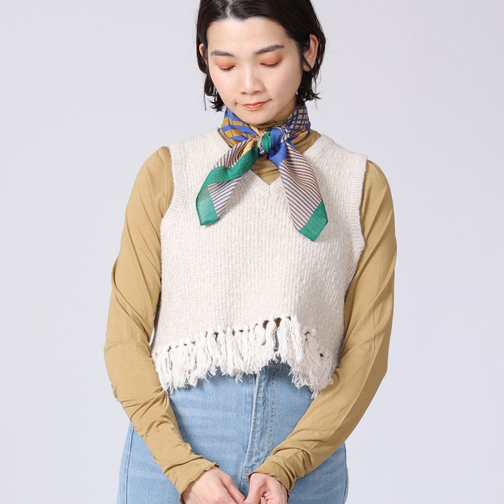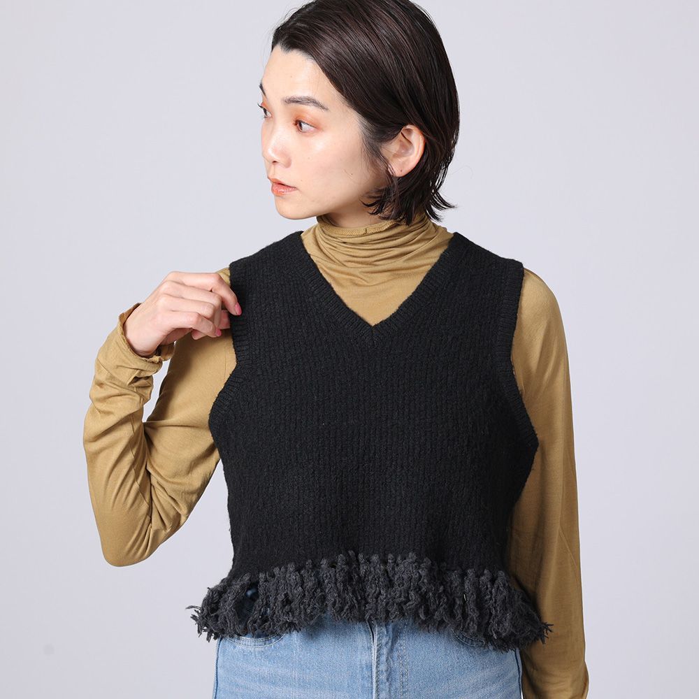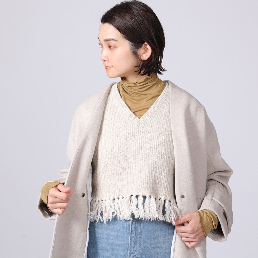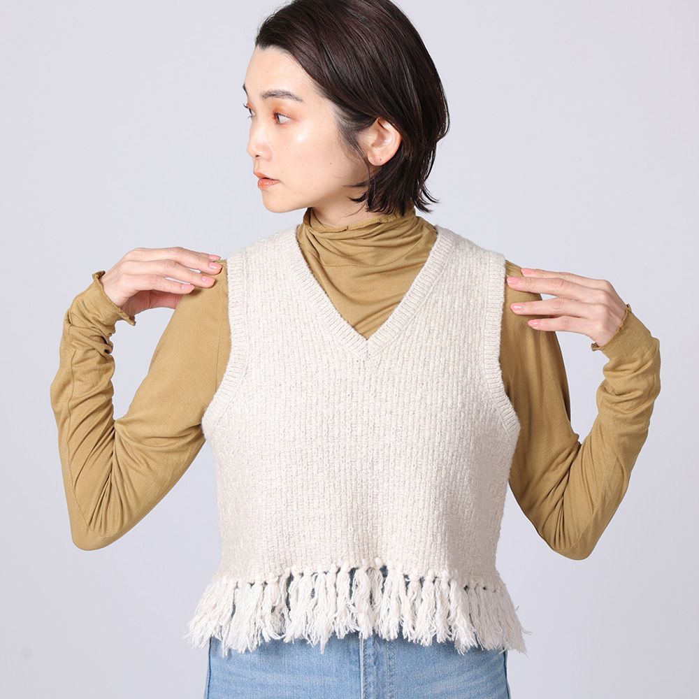 地模様が特徴のベストは、重ね着が楽しめるショート丈に仕上げました。裾のフリンジは本体より少し明るい色目にしてアクセントに。ワンピースに合わせたり、タックの入った太めのパンツに合わせると、バランスが良く脚長効果も演出してくれます。
