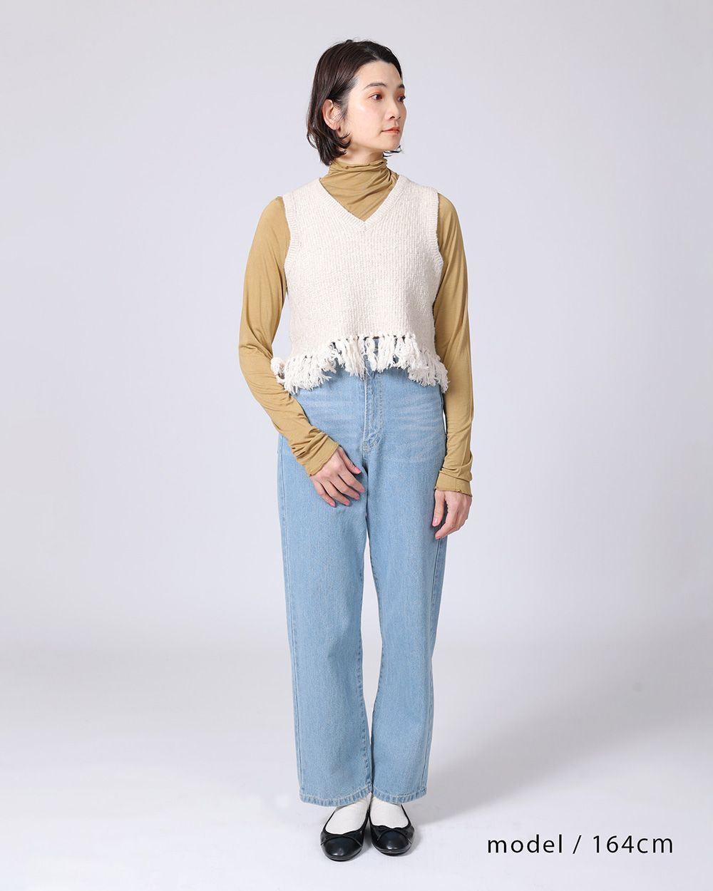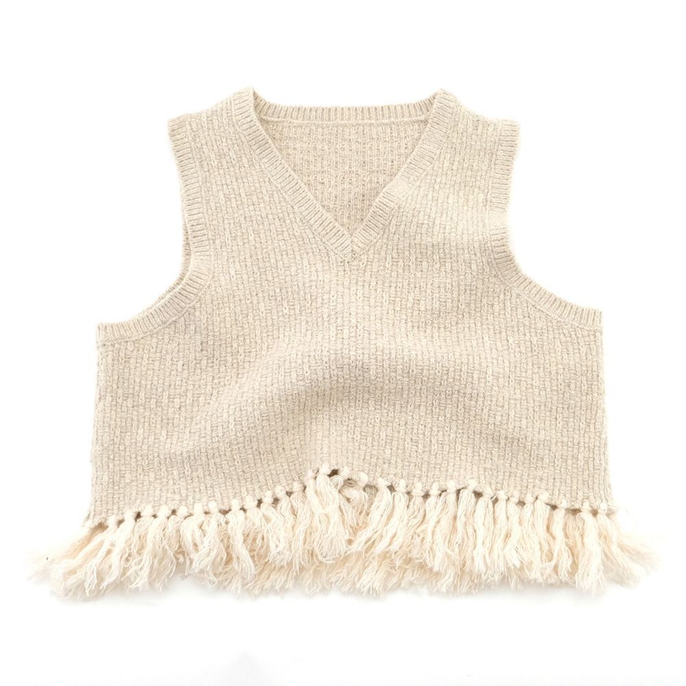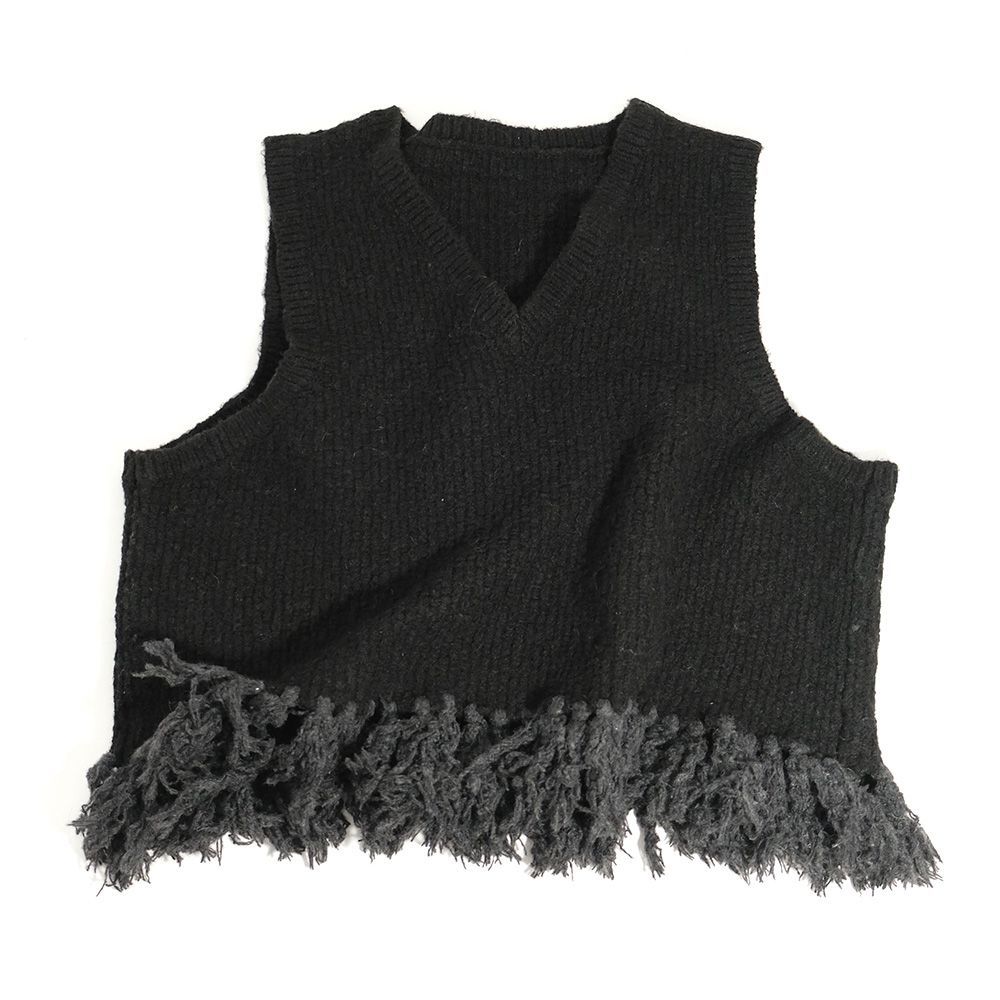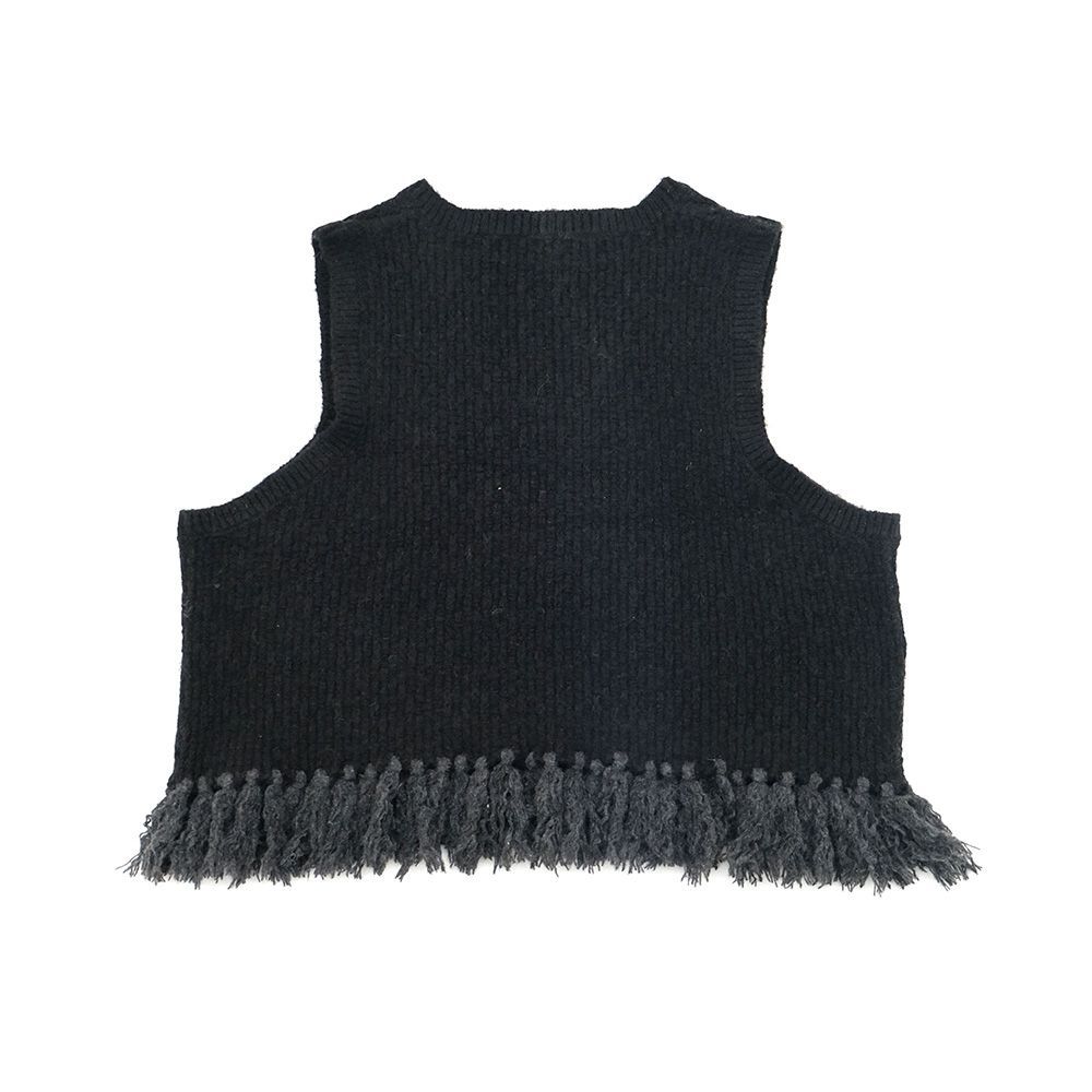 地模様が特徴のベストは、重ね着が楽しめるショート丈に仕上げました。裾のフリンジは本体より少し明るい色目にしてアクセントに。ワンピースに合わせたり、タックの入った太めのパンツに合わせると、バランスが良く脚長効果も演出してくれます。