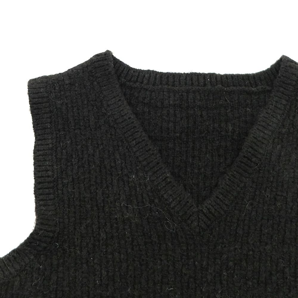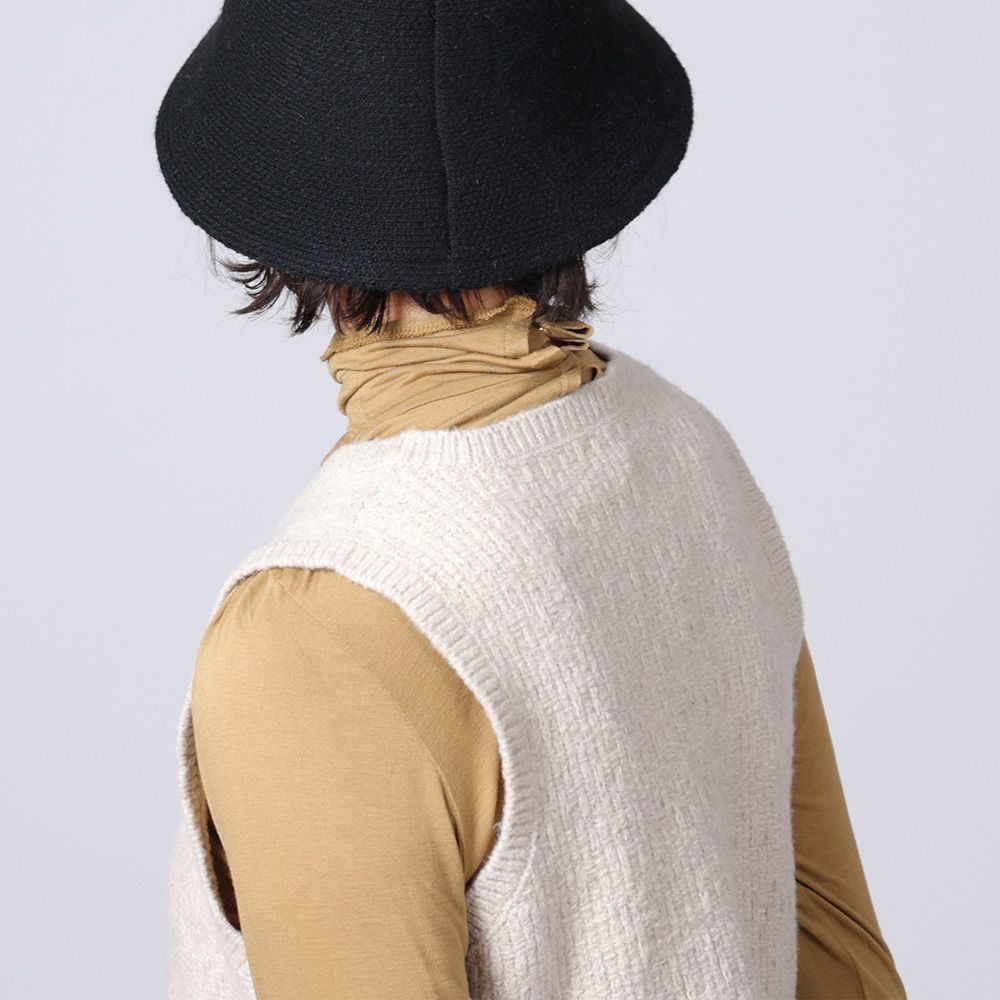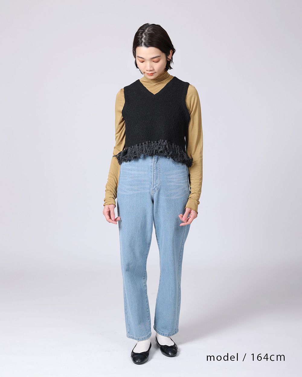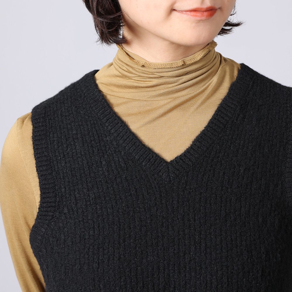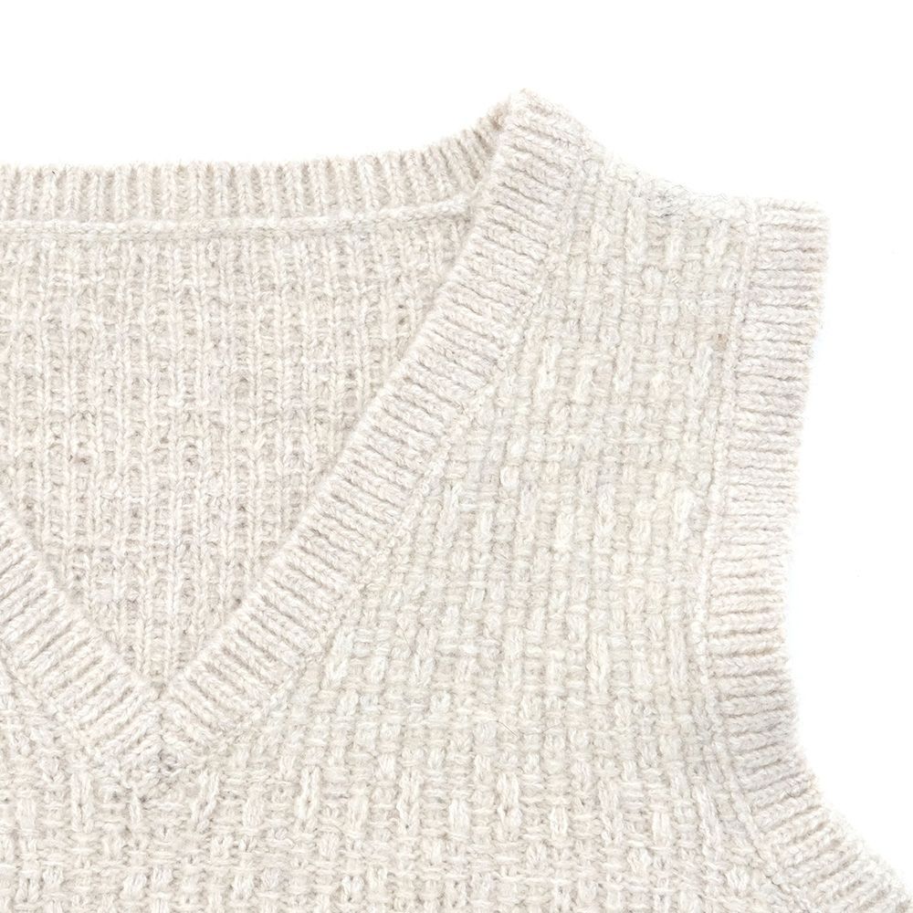 地模様が特徴のベストは、重ね着が楽しめるショート丈に仕上げました。裾のフリンジは本体より少し明るい色目にしてアクセントに。ワンピースに合わせたり、タックの入った太めのパンツに合わせると、バランスが良く脚長効果も演出してくれます。