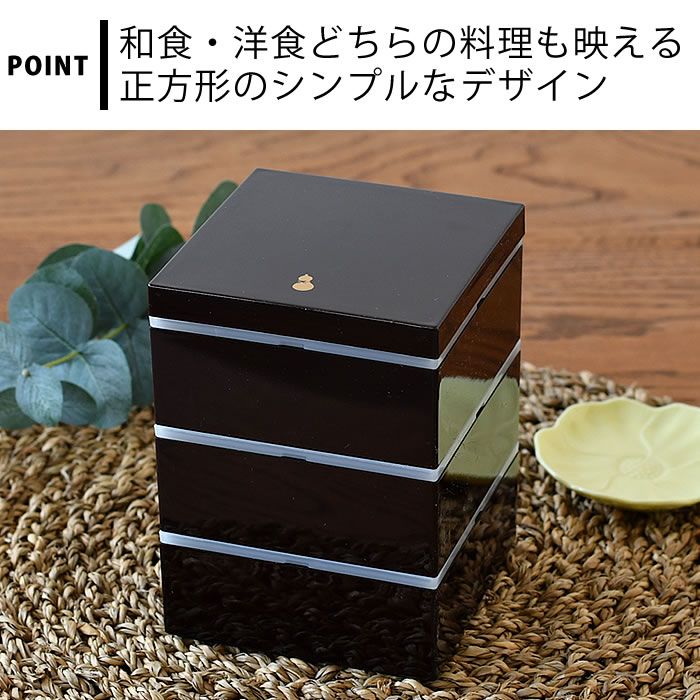オールシーズン大活躍!サブヒロモリのわだん みやび 抗菌3段重 S。小さめサイズが使いやすく、和食・洋食どちらの料理も映える正方形のシンプルなデザインなのでピクニック・運動会・お節料理まで、場所を選ばす年中お使い頂けるので大変便利です♪