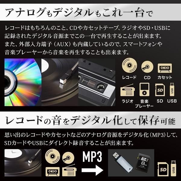 レコードはもちろんのこと、CDやカセットテープ、ラジオやSD、USBに記録されたデジタル音源までこの一台で再生可能。