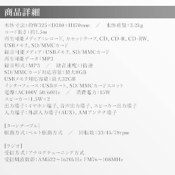 再生可能メディア:レコード、カセットテープ、CD、CD-R、CD-RW、USBメモリ、SD/MMCカード