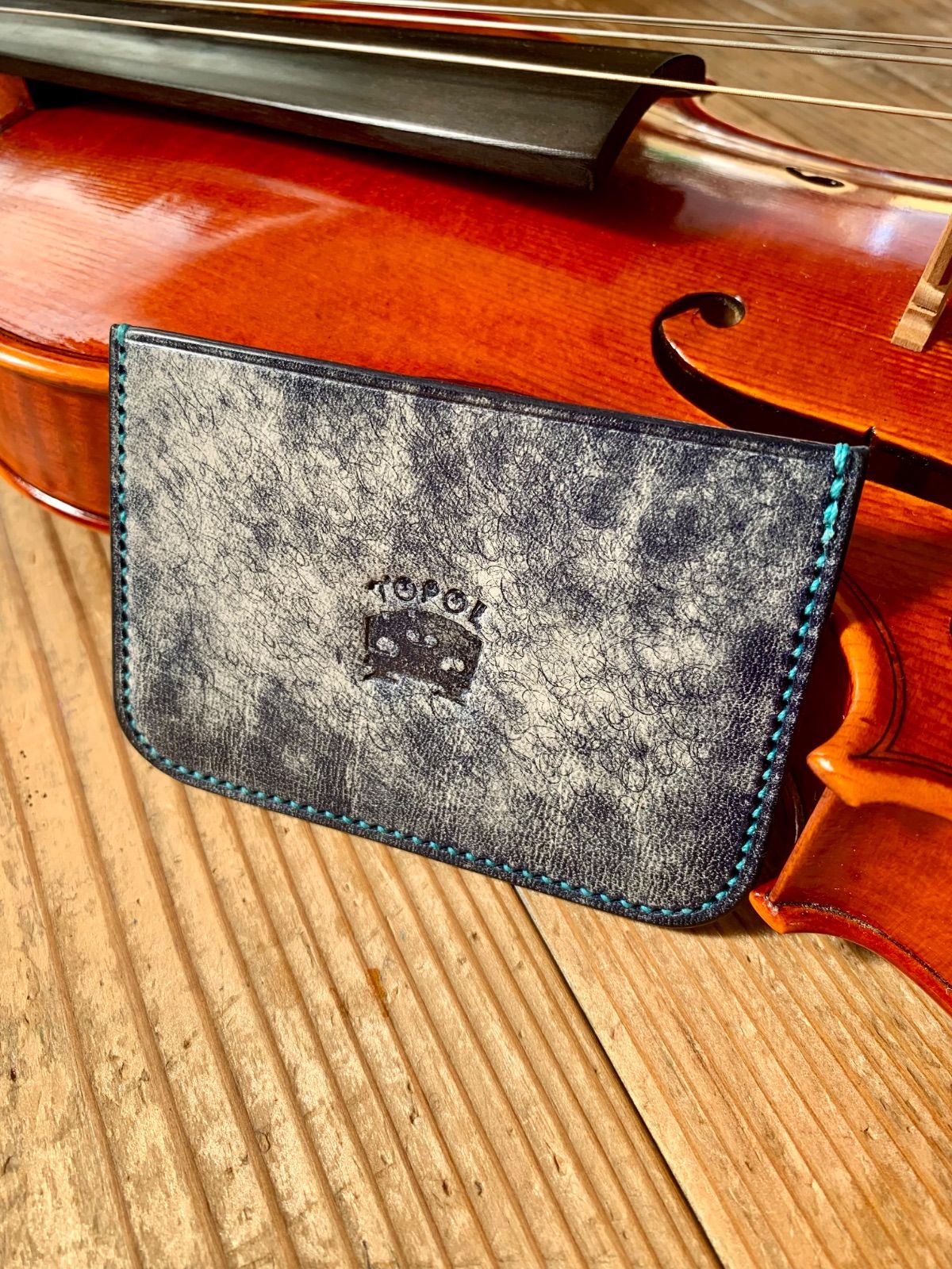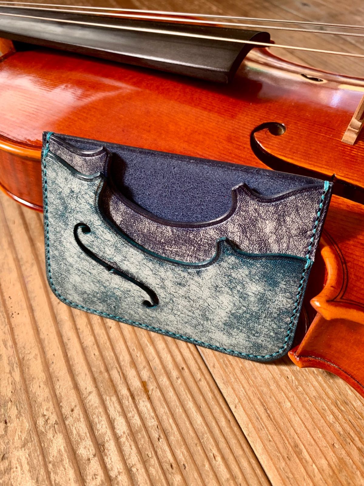 ターコイズとネイビーの深海をイメージした色合いのカードケースです。 ヴァイオリンの綺麗なフォルムをイメージし、f字孔をポイントにしています。