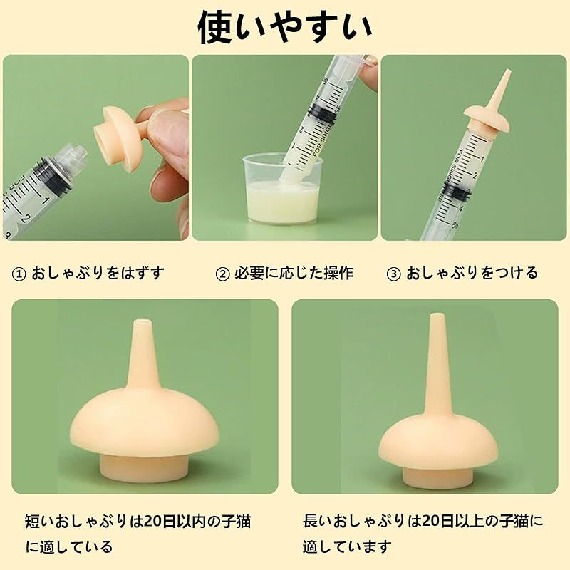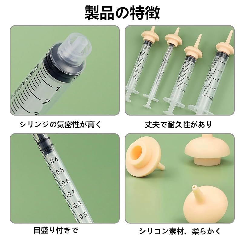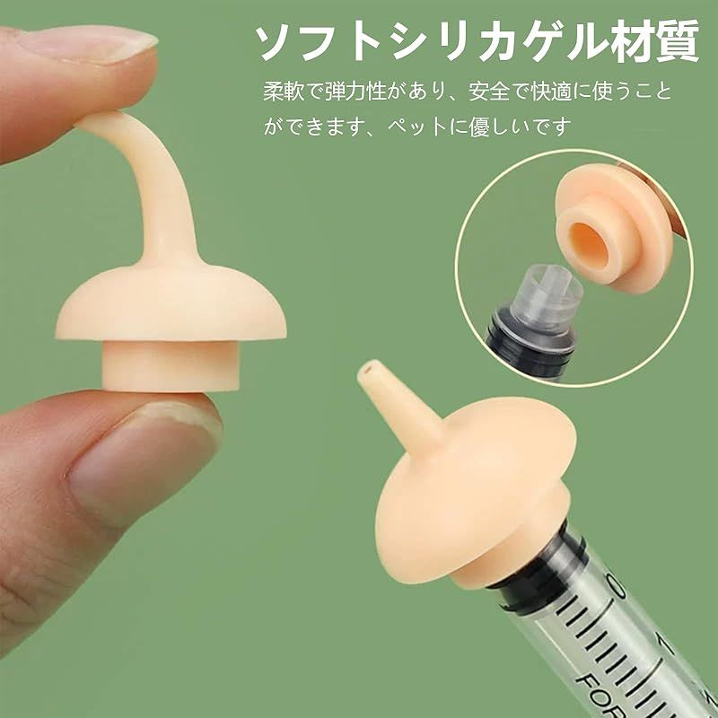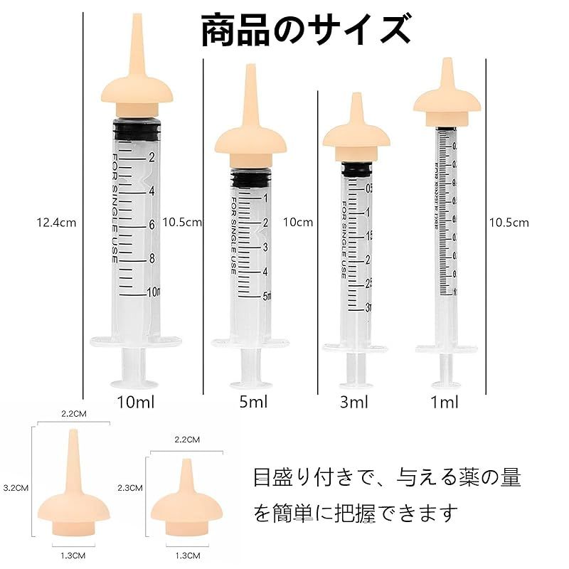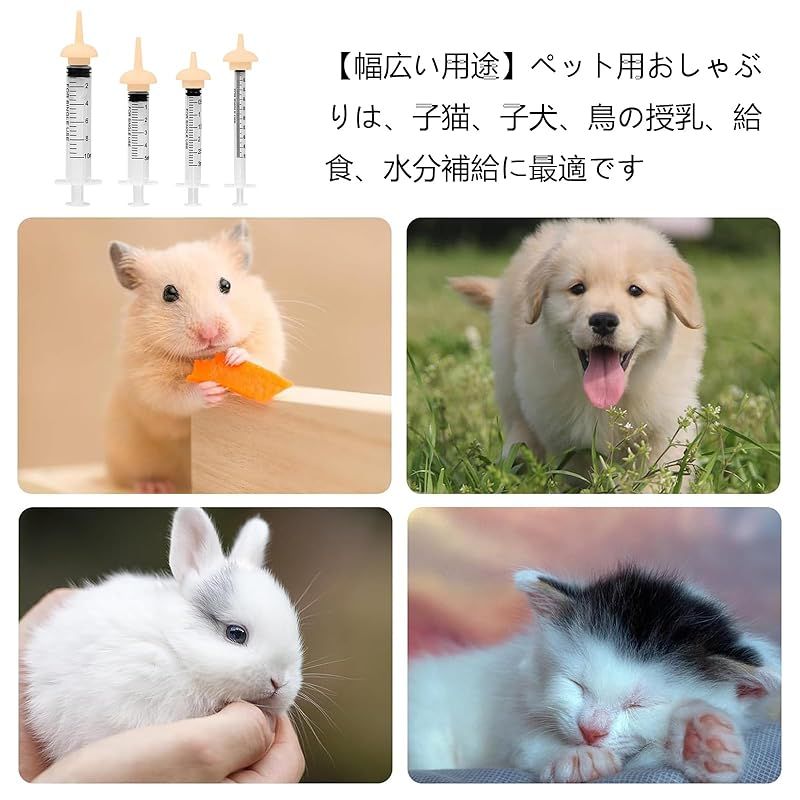 【ペット 授乳 シリンジ】ペット 授乳 シリンジは乳首も付属しております。シリンジの気密性が高く、プランジャーは押したり引いたりしやすく、液体が漏れません。小動物に水、牛乳、薬を飲ませるのに使えます。 【高品質の素材】このおしゃぶりはシリコン素材で作られています、柔らかく、無毒無臭で、安全で快適に使うことができます、ペットに優しいです。シリンジは高品質なプラスチック材質の製作、丈夫で耐久性があり、変形しにくく。 【商品のサイズ】ペット注射器:1 ml:10.5 cm、幅2.2 cm、3 ml:長さ10 cm、幅2.3 cm、5 ml:長さ10.5 cm、幅2.3 cm、10 ml:長さ12.4 cm、幅3.2 cm。 目盛り付きで、与える薬の量を簡単に把握できます。 【幅広い用途】ペット用おしゃぶりは、子猫、子犬、鳥の授乳、給食、水分補給に最適です。さらに、マウス、ウサギ、リスなどのすべての哺乳動物に使用できます。