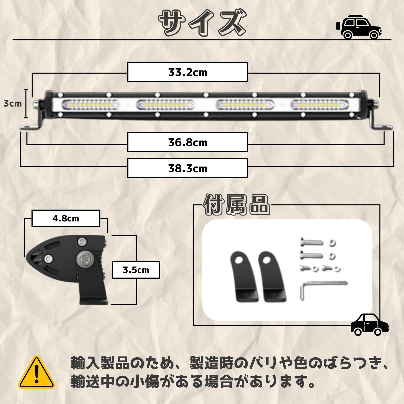 【サイズ・仕様】サイズ:本体 約33.2cm×5cm×3cm、ステー取付幅約36.8cm(装着時38.3cm)/材質:アルミニウム、LED/電圧:DC1032V(12V/24V兼用)/出力:120W/色温度:6500K/セット内容:ライト×1、取付金具一式