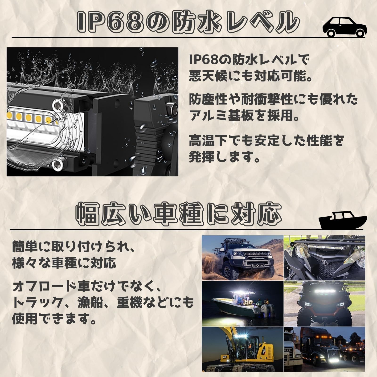 【12V/24V対応で幅広い用途に対応】バーライト形状で取り付けやすく、12V・24V兼用設計により乗用車、オフロード車、トラック、軽貨物車、農機具、船舶など多様な車両に対応。デイライトとしても使用でき、多彩なシーンに柔軟に活用可能です。