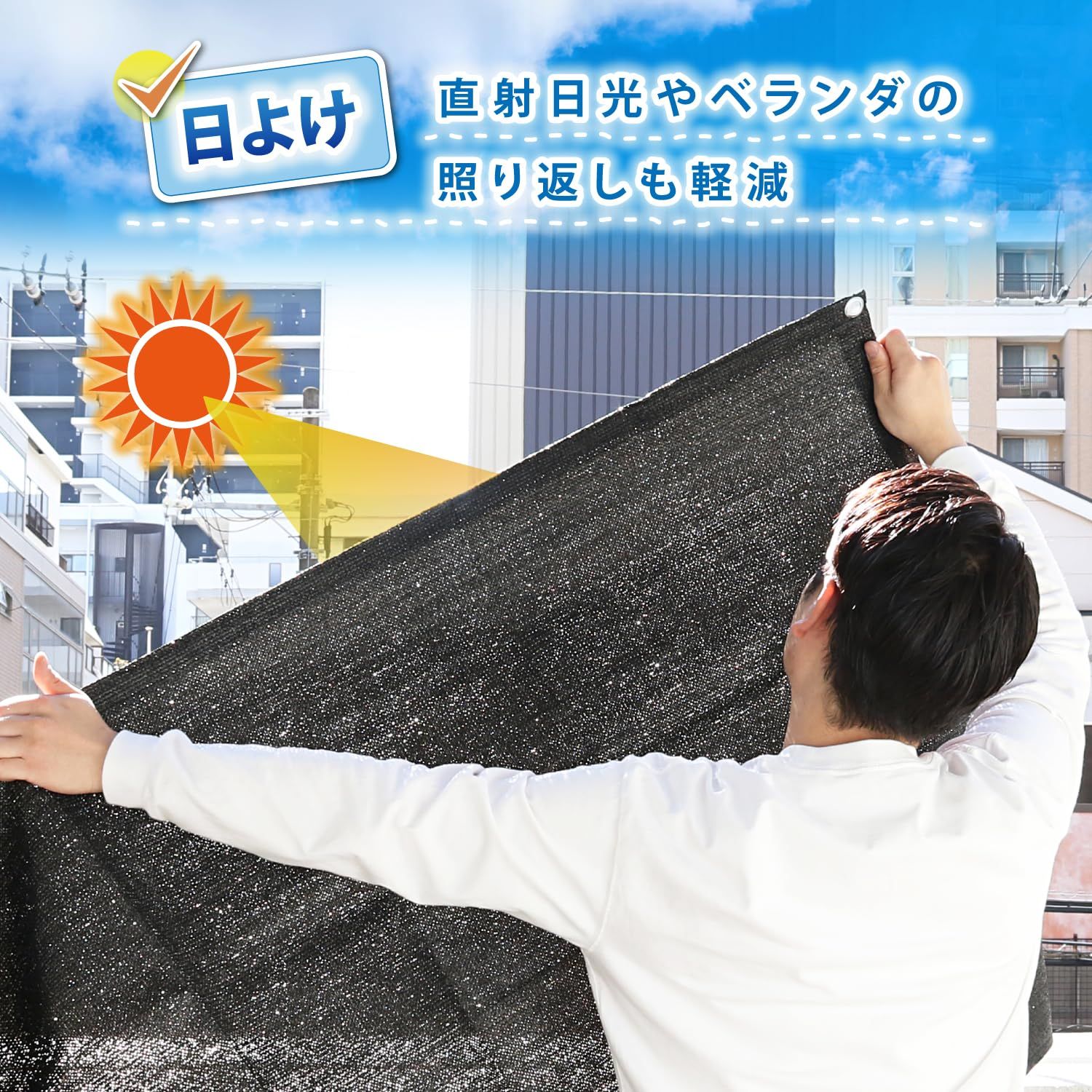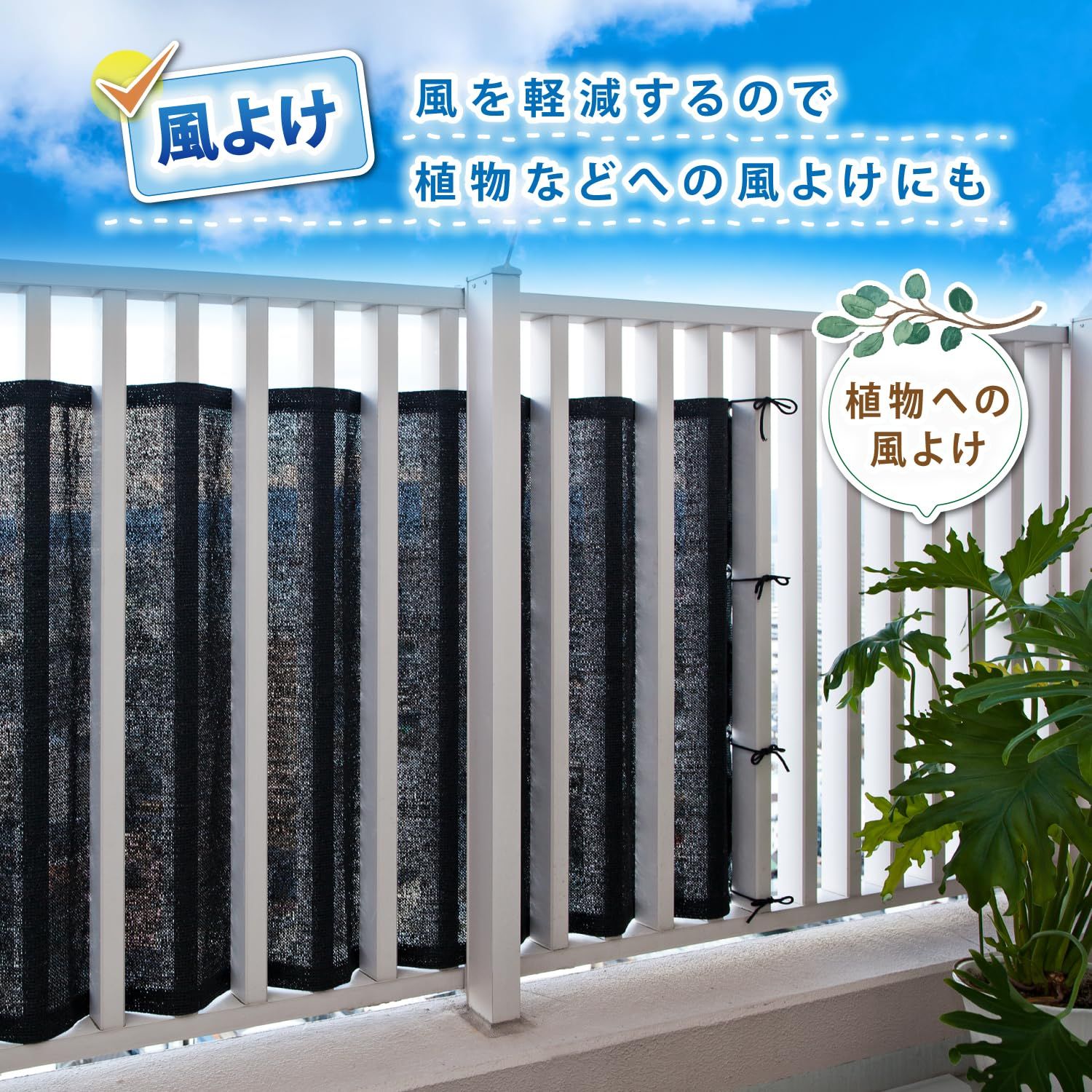 【風を通し視線や日差しを遮るシート】:風を通しながら、気になる視線や日差しを遮るベランダ目隠しシート。長さ約270cmのロングサイズなので、広いベランダやバルコニーの日よけにも。