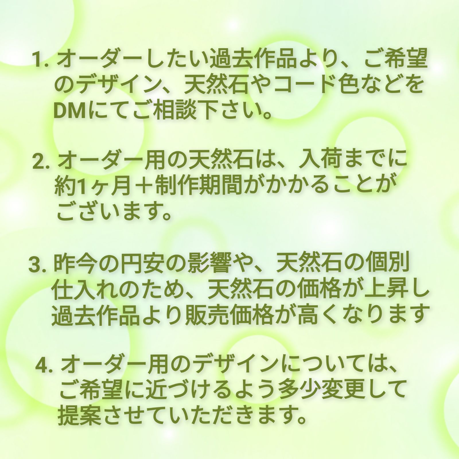 大前提として、マクラメ編みに使用する【天然石】は、同じもの(品質や形やサイズ)を在庫しておらず、その石のメージを考え一期一会でデザイン制作している【一点物】として販売しております。