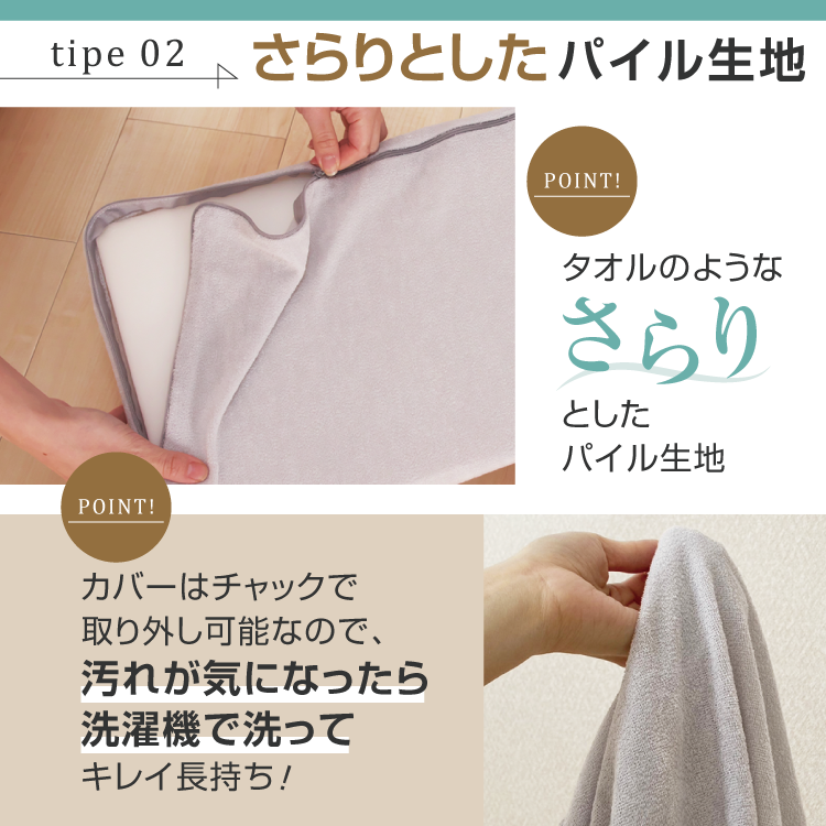 ・着脱のしやすい大きく開くファスナーと肌触りの優しいパイル生地のカバーセットも用意しました。