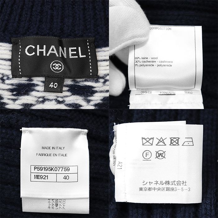 【シリーズ】CHANEL シャネル カーディガン P59195 ニット セーラーカラー アンカー&COCOマークボタン カシミヤブレンド レディース 40 紺 白 総柄