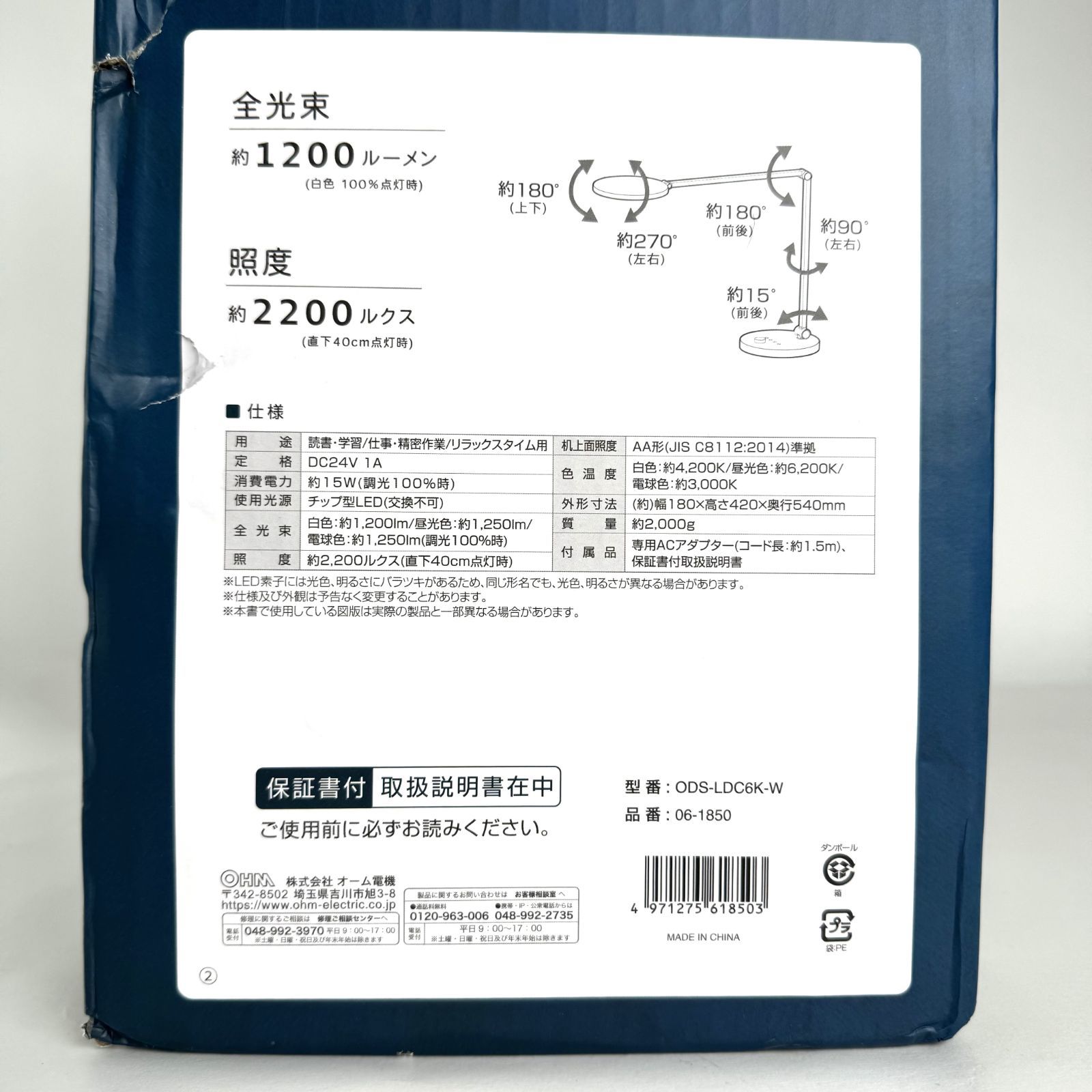 LEDデスクライト OHM オーム電機 2025年製 調光調色 タイマー機能付 ODS-LDC6K-W