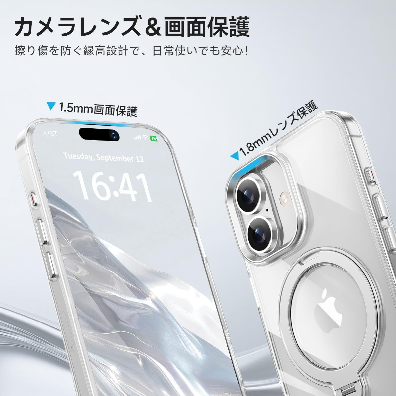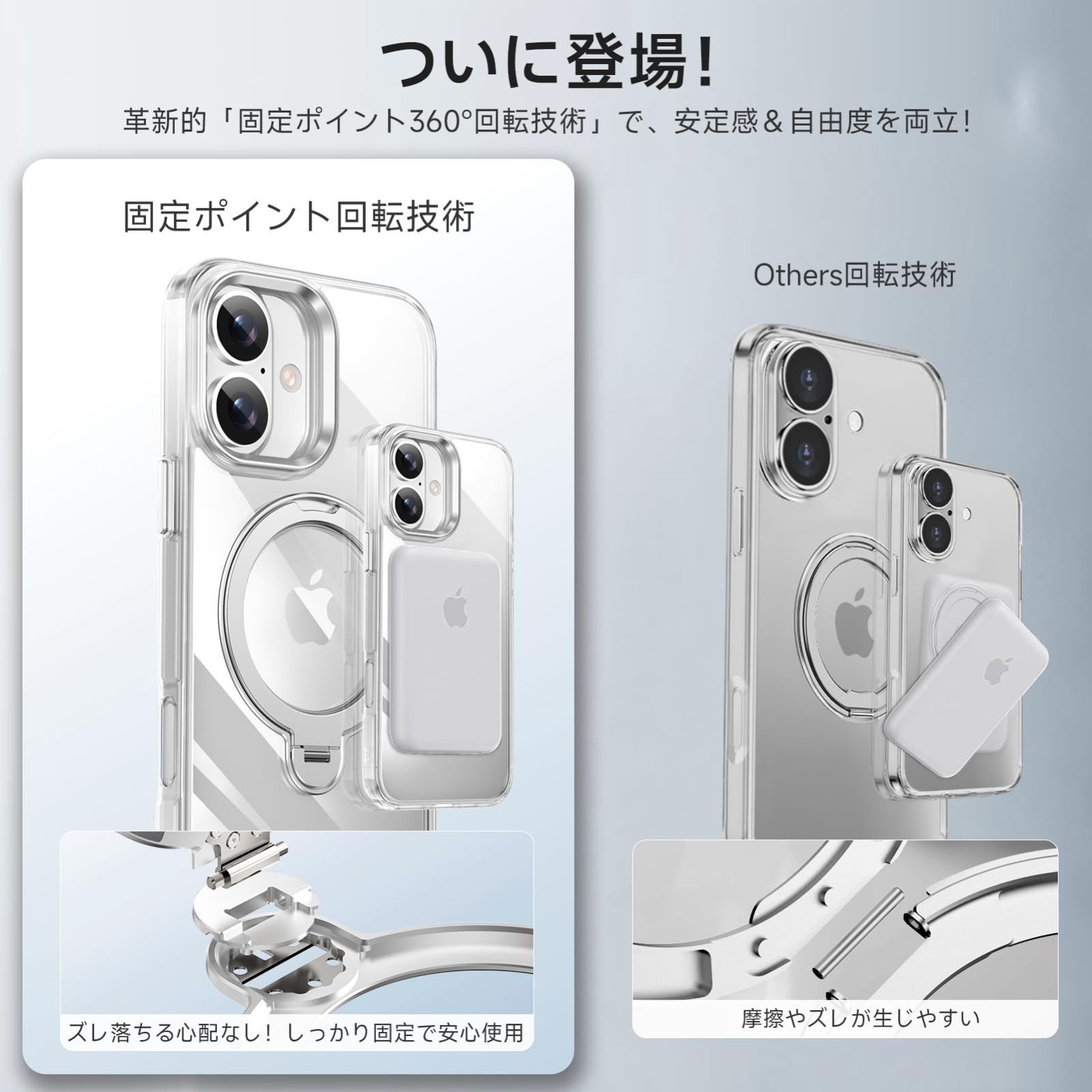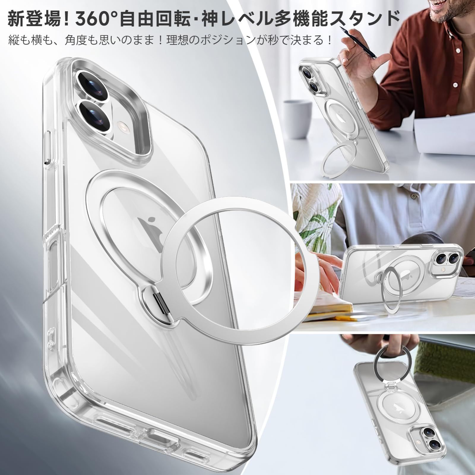 【最新!耐久性UP!360度回転スタンド】このiphone 17 用 ケースには、最新の360度回転スタンドが搭載されており、縦横の角度を0°170°で自由に調整できます。市販のスタンドが横置きに対応できないという欠点を完全に解消しました!動画視聴やビデオ通話時に、最適な角度を簡単に設定でき、横置きの不便さを解消します。さらに、強力なベアリングを採用し、リング部分の耐久性が大幅に向上しました。最大10倍の耐久性を実現し、長期間使用することができます。片手で操作でき、便利さと耐久性を兼ね備えた優れたアイテムです。