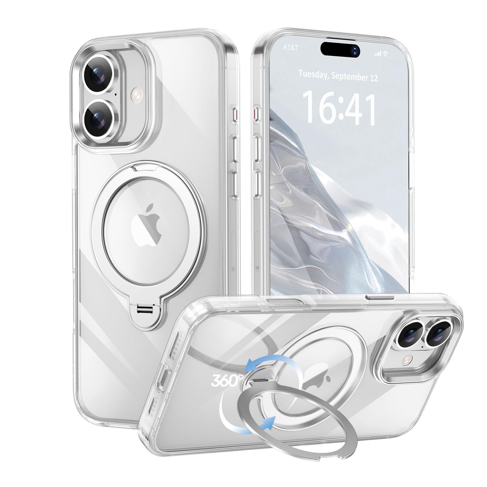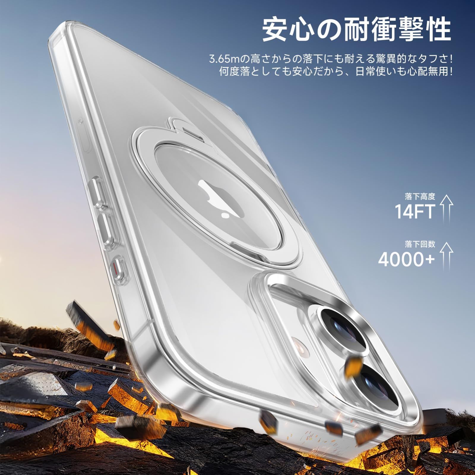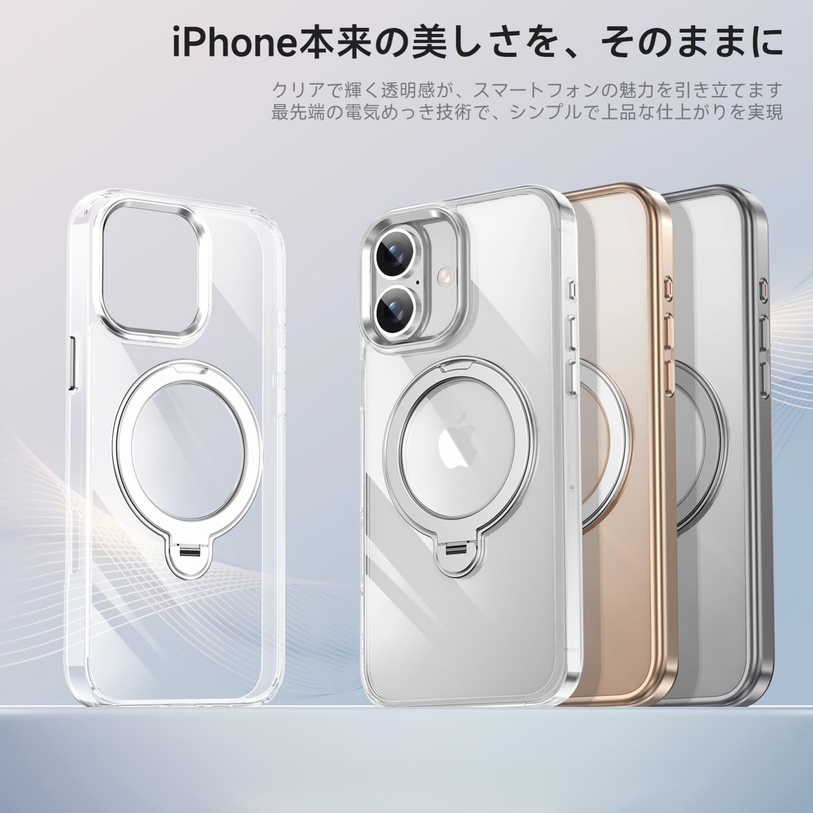【透き通る上質感・多機能360°回転スタンド】KMAMBNG iPhone 17 用 ケース Magsafe対応【耐衝撃・金属感・真空メッキ・黄変防止・ストラップホール付き】縦横両立 角度自在 調整可能 磁吸機能でワイヤレス充電対応 おしゃれ スマホケース(クリアiPhone 17)