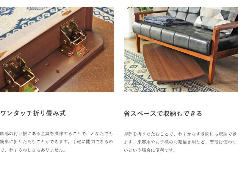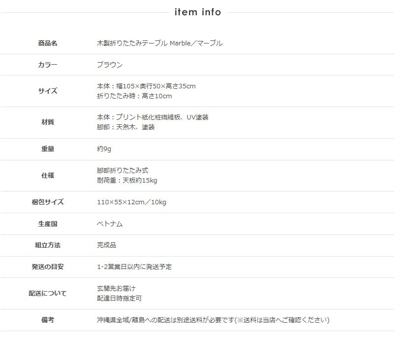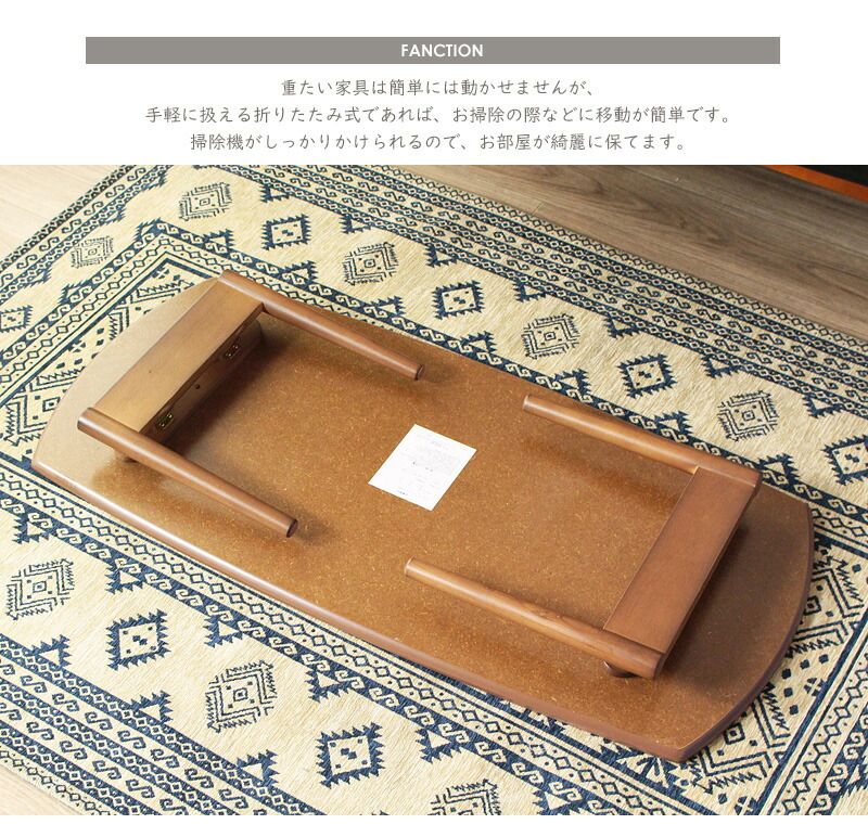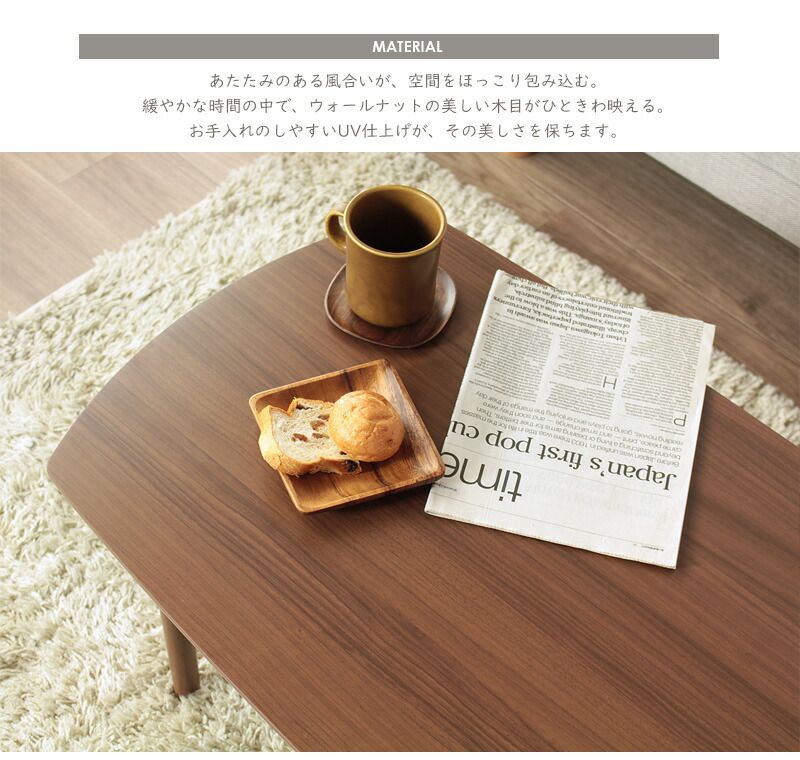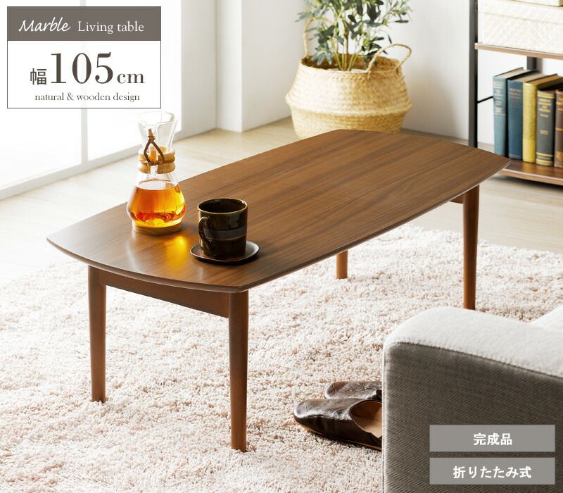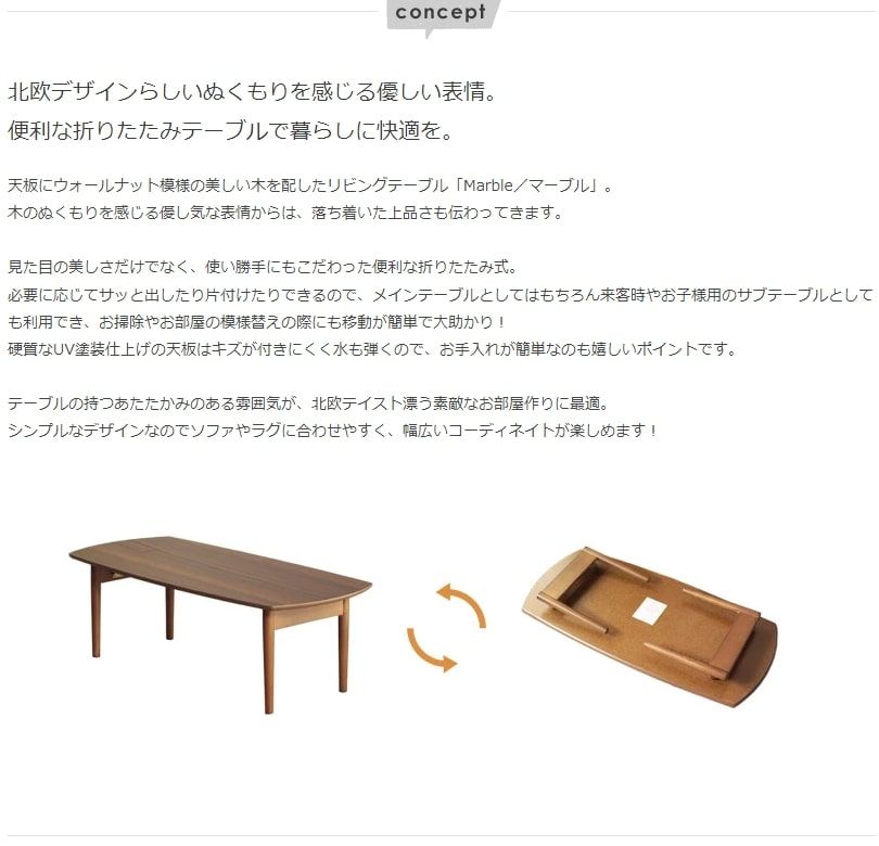 北欧デザインらしいぬくもりを感じる優しい表情。便利な折りたたみテーブルで暮らしに快適を。天板にウォールナット模様の美しい木を配したリビングテーブル「Marble/マーブル」。木のぬくもりを感じる優し気な表情からは、落ち着いた上品さも伝わってきます。見た目の美しさだけでなく、使い勝手にもこだわった便利な折りたたみ式。必要に応じてサッと出したり片付けたりできるので、メインテーブルとしてはもちろん来客時やお子様用のサブテーブルとしても利用でき、お掃除やお部屋の模様替えの際にも移動が簡単で大助かり!硬質なUV塗装仕上げの天板はキズが付きにくく水も弾くので、お手入れが簡単なのも嬉しいポイントです。テーブルの持つあたたかみのある雰囲気が、北欧テイスト漂う素敵なお部屋作りに最適。シンプルなデザインなのでソファやラグに合わせやすく、幅広いコーディネイトが楽しめます!サイズ本体:幅105×奥行50×高さ35cm折りたたみ時:高さ10cm素材本体:プリント紙化粧繊維板、UV塗装脚部:天然木、塗装仕様脚部折りたたみ式耐荷重:天板約15kg完成品●