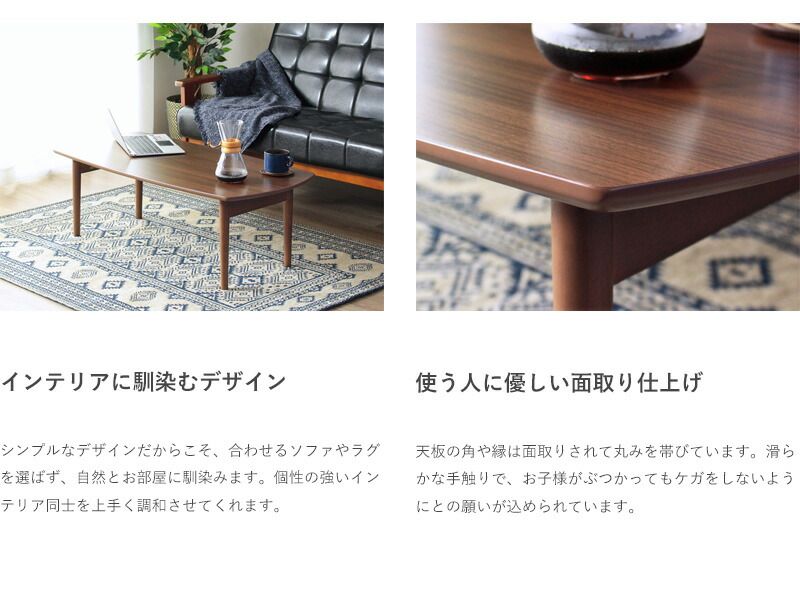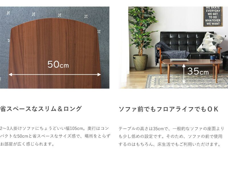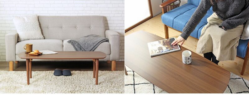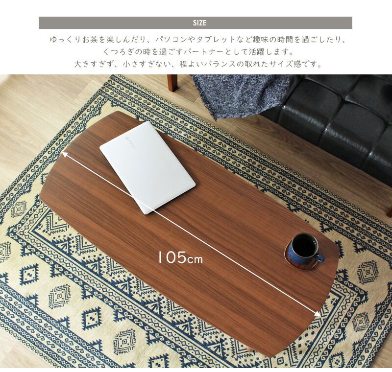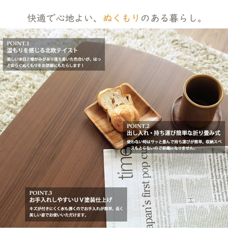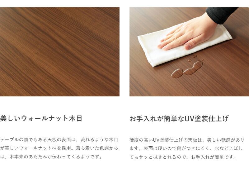 北欧デザインらしいぬくもりを感じる優しい表情。便利な折りたたみテーブルで暮らしに快適を。天板にウォールナット模様の美しい木を配したリビングテーブル「Marble/マーブル」。木のぬくもりを感じる優し気な表情からは、落ち着いた上品さも伝わってきます。見た目の美しさだけでなく、使い勝手にもこだわった便利な折りたたみ式。必要に応じてサッと出したり片付けたりできるので、メインテーブルとしてはもちろん来客時やお子様用のサブテーブルとしても利用でき、お掃除やお部屋の模様替えの際にも移動が簡単で大助かり!硬質なUV塗装仕上げの天板はキズが付きにくく水も弾くので、お手入れが簡単なのも嬉しいポイントです。テーブルの持つあたたかみのある雰囲気が、北欧テイスト漂う素敵なお部屋作りに最適。シンプルなデザインなのでソファやラグに合わせやすく、幅広いコーディネイトが楽しめます!サイズ本体:幅105×奥行50×高さ35cm折りたたみ時:高さ10cm素材本体:プリント紙化粧繊維板、UV塗装脚部:天然木、塗装仕様脚部折りたたみ式耐荷重:天板約15kg完成品●